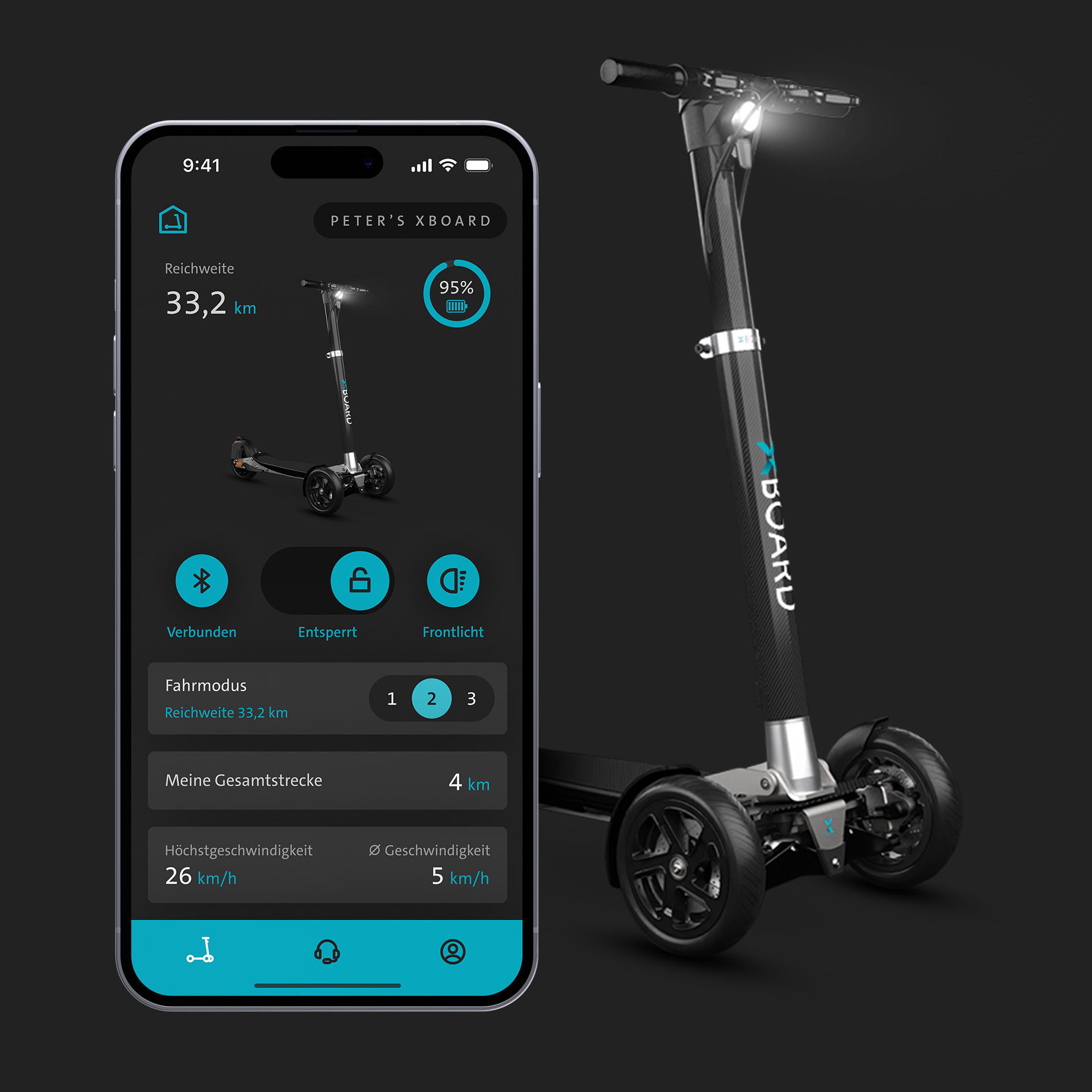 Verbinde dein XBoard via Bluetooth mit der XBoard App und erlebe, wie dein Fahrerlebnis auf das nächste Level gehoben wird. Mit aussagekräftigen Statistiken zu deinem Fahrverhalten, einem Driving Mode, der die wichtigsten Kennzahlen hervorhebt, Passwortschutz für dein Fahrzeug und einem Service Center, das dir tiefe Einblicke in dein XBoard bietet – inklusive direktem Kontakt zu unserem Team. Werde Teil einer bewegenden Community und erlebe, wie deine Fahrten smarter werden.